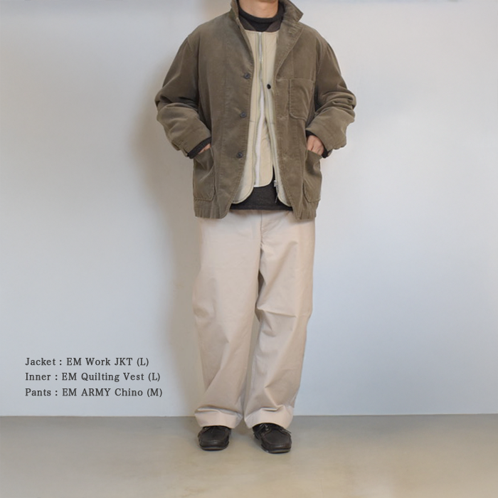 テーラードジャケットほどカチッとしておらず、ワーク特有の太めの身幅、アームがデザインの特徴です。